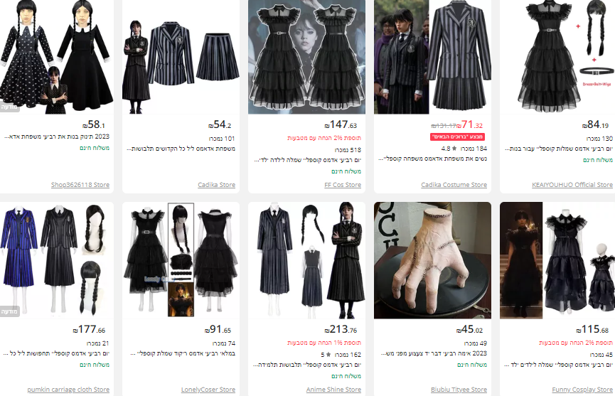 באלי אקספרס תוכלי לקנות ערכות שלמות או אביזרים ולהרכיב תחפושת וונסדיי אדמס מושלמת. בשביל לדלג על ההסברים, לחצו על התמונה ותגיעו לעמוד עם כל המוצרים והערכות הרלוונטיות באלי אקספרס.